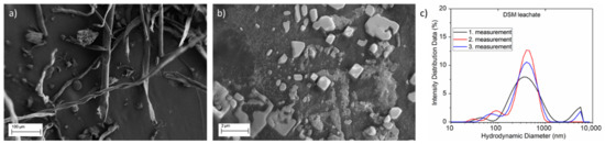 In addition, to prove the leaching of nanoplastic particles in the filtrate of whole DSM leachate, particle size distribution (PSD) analysis, which was recorded three times, was performed (Figure 6c). With this analysis, the presence of nanoscale particles released by DSMs was confirmed. The particles have an average diameter of 305 nm. The majority of the particles (87%) have a diameter of 430 nm, with a standard deviation of 196.1 nm.