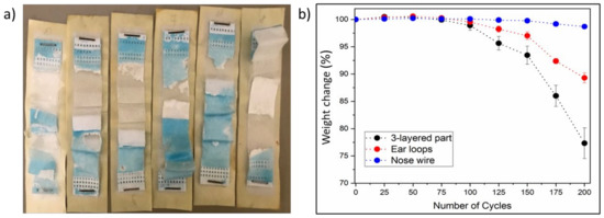 After manually decomposing 100 different DSMs into five components (shown in Figure 1), we used the basic statistical tools in Microsoft Excel to obtain the results shown in Figure 2. The average mass of a single mask was 3.1205 g. The maximum mass fraction of the mask represents a three-layered part, resulting in 79.7%. This percentage is evenly distributed among all three layers and most likely contributes to micro/nanoplastic fragmentation. Ear loops represent 12.4% of the mass of the DSMs, and the lowest percentage of the DSM mass is represented by nose wire, i.e., 7.9%.
