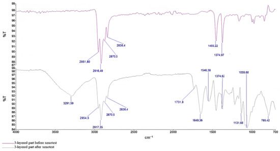 FTIR spectra of the 3-layered part before and after Xenotest.