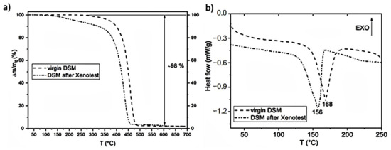 TGA (a) and DSC (b) analyses of whole DSM before and after Xenotest.