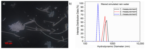 The simulated rainwater was collected during the test and analyzed under the optical microscope, which allowed us to isolate microplastic particles produced by photodegradation. As can be seen in Figure 10a, a DSM is degraded by photodegradation into extremely inhomogeneous microparticles, ranging from a few hundred micrometers to less than 1 µm. The formation of nanoplastics and their presence in the simulated rainwater were additionally confirmed by DLS analysis, the result of which can be seen in Figure 10b.