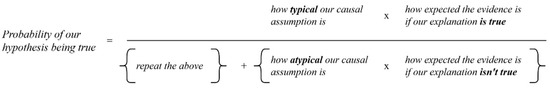 The depiction of a BA in plain English is helpful when the researcher tries to avoid an erroneous operationalization of the method. Expressing ranges of certainties and describing the data in Bayesian terms makes it easier to spot potential conjunctions where there should not be ones (especially between priors and consequents). It also helps in identifying logical fallacies. A semantic depiction of certainties or degrees of belief is what we already do anyway when applying our knowledge and our intuition to draw causal inferences from propositions (e.g., by expert guess). We found it, therefore, helpful to translate the epistemic interpretation of BA (formula (2)) into plain English, as shown here and adapted from Carrier (2012) [46] (see Figure 2):