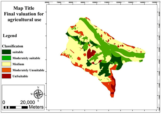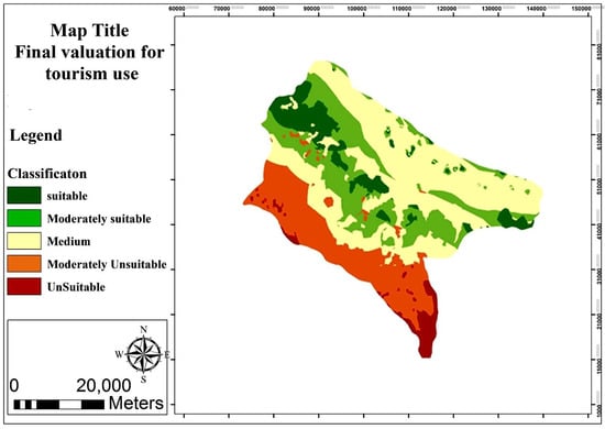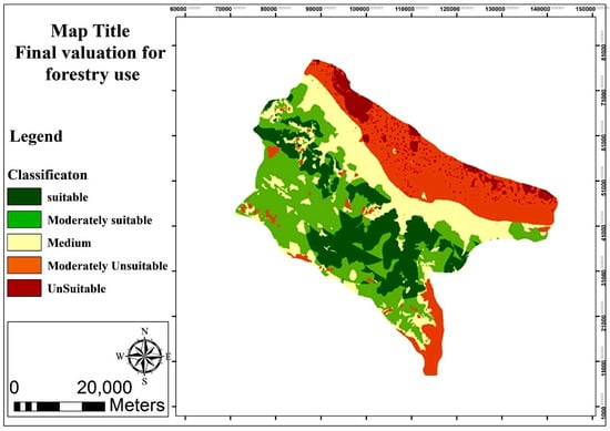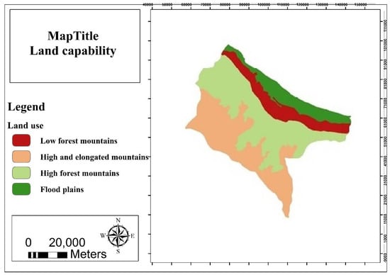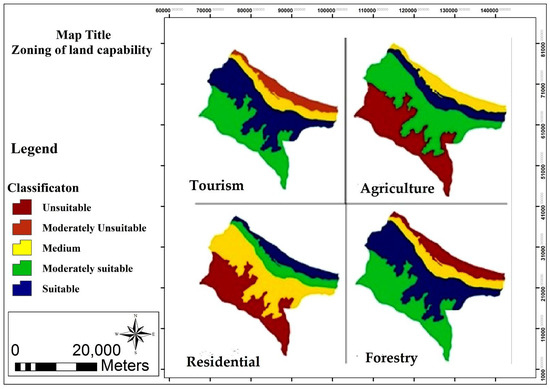 As noted, there are four types of capabilities for status quo lands. Land capabilities encompass flood plains, high and elongated forest mountains, high forest mountains, and low forest mountains. Figure 7 shows land valuation for four uses: agriculture, tourism, forestry, and settlement. The prioritization with reference to the nature of activities was quite a crucial point that was observed in the assessment of land potential, more precisely, flood plains for settlement, forested mountains for tourism, low-lying areas for agriculture, high and elongated forest mountains for forestry were in the first rank.