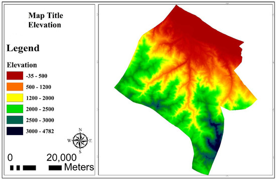 The elevation map was extracted with an accuracy of 10 m by using topographic maps of the region. A digital Elevation Model (DEM) is accurate to 10 m. Curved lines provide the topographic map of elevation fluctuations in the study area, but they can be detected more easily and quickly by preparing DEM. Figure 4 indicates the elevation fluctuations along with the consideration classes. Altitude represents the change of climatic fluctuations. The amount of energy each point of the earth receives from the sun is different due to the elevation difference. The percentage of humidity and precipitation changes as the pressure increases and the altitude decreases. Therefore, elevation changes can profoundly influence temperature, precipitation, and humidity parameters.
