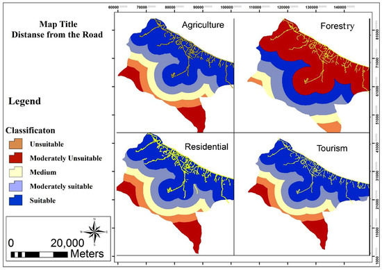The suitable distance of the four types of land uses from roads is shown in Figure 8. Access to roads is vital for residential, tourism, and agricultural activities.