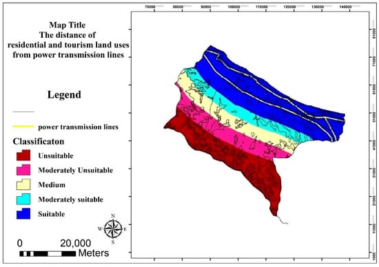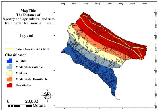 The evaluation of activities in terms of distance from power lines is shown in five sorts: unsuitable, moderately unsuitable, medium, moderately suitable, and suitable. The optimal place for residential and tourism land uses close to power transmission lines, and for forestry and agriculture, one is the distance from these lines. Figure 9 and Figure 10 show the distance of land uses from power lines.