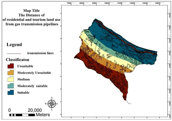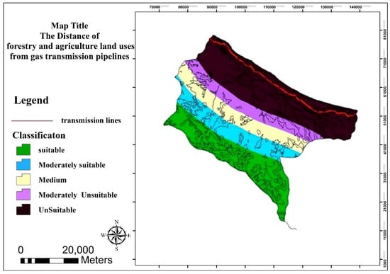 It is necessary to consider the minimum distance from the gas transmission pipelines for tourism and residential activities; conversely, the farther the distance is, suitable it is for agriculture and forestry. The proper distance for residential and tourism, such as forestry and agriculture land use from the gas transmission pipelines, is shown in Figure 11 and Figure 12, respectively.