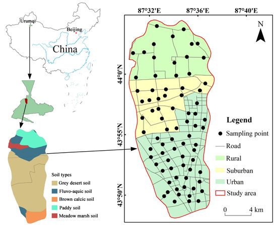 We conducted our field research in the city of Urumqi, which is the provincial capital of the Xinjiang Uyghur Autonomous Region, China. Urumqi city is located in the southern part of the Kurbantonggut Desert and the northern part of the Tarim Basin, with a total urban area of about 480 km2. Urumqi city is characterized by a continental desert climate, with an annual mean temperature, precipitation, and evaporation capacity of about 6.7 °C, 280 mm, and 2730 mm, respectively. The main factories are primarily located in the northern and northeastern parts of the city, while roads with high traffic volumes stretch across the city center [25]. Compared to other cities in Xinjiang, Urumqi is characterized by significant conflict between urbanization, industrialization, and the ecological environment. As such, a typical and continuous urban-suburban-rural gradient zone (30 km × 11 km) (87°28′–87°37′ E and 43°48′–44°04′ N) was selected in the Urumqi area to study the effects of urbanization on trace element concentrations in topsoil (Figure 1). Each gradient extended over a distance of approximately 8 km. The urban gradient was the commercial core area and service industry distribution area of Urumqi. The land-use types are mainly commercial areas, cultural and educational areas, and residential areas. The land-use types in the rural gradient were mainly cultivated land. The suburban area is a transitional area between urban and rural areas, containing agricultural land, industrial land, and residential areas. The soil type in the urban and suburban gradients is mainly grey desert soil, while the soil types in the rural gradient are paddy soil, fluvo-aquic soil, and meadow marsh soil.