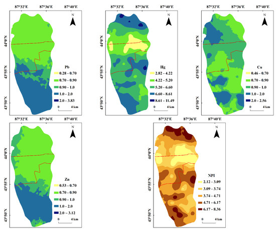 It can be seen from the spatial distribution patterns of the NPI values of trace elements in the topsoil in the study area that the spatial distribution pattern of NPI is basically consistent with the spatial distribution pattern of the Pi value of the Hg element, which further indicates that Hg is the main contaminant in the topsoil in the study area. However, the NPI values of trace elements in urban soils gradually decreased from the west to the east, whereas the NPI values of trace elements in suburban soils gradually decreased from the south to the north, and the NPI values of trace elements in rural soils decreased from the north to the south.