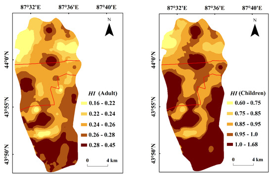Figure 3 illustrates the spatial distribution of the HI values of trace elements in the soil for children and adults, as it was determined that children had higher levels of non-carcinogenic risk, especially in the southern parts in the study area. However, the spatial distribution patterns of the HI values of trace elements for both children and adults seem to be consistent with the spatial distribution pattern of the Pi value of As, which further indicates that As is the main non-carcinogenic health risk factor in terms of topsoil in the study area.