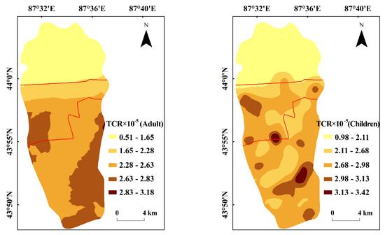 Figure 4 depicts the spatial distribution patterns of the calculated TCR values for both children and adults. As shown in Figure 4, the spatial distribution patterns of the TCR values for adults and children are basically the same, with relatively higher risk areas. The areas with higher TCR values are mainly distributed in the southern parts of Urumqi, while the areas with lower TCR values are mainly distributed in the northern parts of Urumqi. The contamination of soil with As was higher in the samples from the high-risk area highlighted by the TCR values, which was consistent with the spatial distribution of HI values.