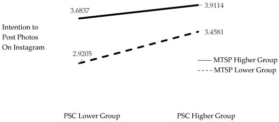 Multiple regression analysis was conducted to examine the main effects and interaction effects of independent variables on the intention to post photos on Instagram (Table 3). The model was significant (F = 43.711 at p < 0.001), and R2adj was 0.348. Social interaction (β = 0.238, p < 0.001), ideal-self presentation (β = 0.142, p < 0.01), true-self presentation (β = 0.272, p < 0.001), and public self-consciousness (β = 0.174, p < 0.001) were significantly positively associated with the intention to post photos on Instagram. True-self presentation had the strongest effect, followed by social interaction, public self-consciousness and ideal-self presentation. There was a significant negative interaction effect of MTSP x PSC (β = −0.081, p < 0.05). The study results supported Hypotheses 1 through 4 and partially supported Hypothesis 5.