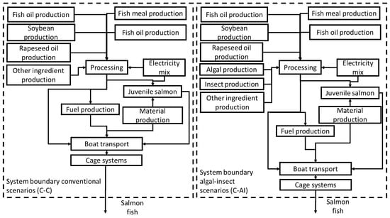 We carried out a cradle-to-farm gate ALCA. Attributional LCA assesses the existing systems in considerable detail. ALCA has low uncertainties and is well suited for the identification of system improvements [18]. The functional unit is 1 kg of live weight of salmon at the fish farm [11,19,20]. Two different baseline scenarios were considered in this study: (1) cage system with a conventional feed composition (C-C), and (2) cage system with algae–insect-based meal (C-AI). All systems are assumed to be located in the Mid-West Norway region.