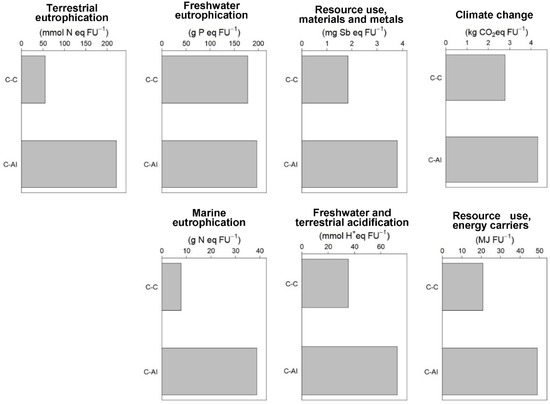 The baseline C-C scenario obtained a lower impact than the C-AI system for all impact categories analysed (51.5% on average). The largest difference between the C-C and C-AI systems was observed for marine eutrophication (79.9%), while the lowest variation was obtained for freshwater eutrophication (9.6%) (Figure 2).