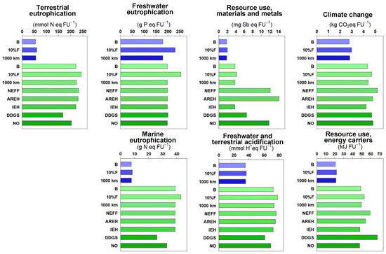 For the 10% F SA scenario in both C-C and AI systems, the freshwater, marine, and terrestrial eutrophication increased up to 29%. In contrast, for DDGS and NO SA scenarios, a reduction in eutrophication impacts was obtained for marine and terrestrial eutrophication (up to 32.4%). For freshwater eutrophication in DDGS and NO SA scenarios and for all the other SA scenarios (i.e., 1000 km in C-C and AI; NEFF; AREH and IEH), more limited variation in eutrophication impacts was obtained (<4.0%) (Figure 3).