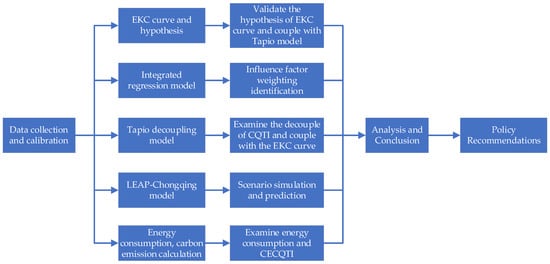 Reviewing the previous excellent studies, we can find that these excellent scholars have mainly conducted large-scale studies on the transportation industry and environmental pressure through models and simulations, which makes these excellent studies have some limitations in the depth and breadth of content, such as single models and incomplete classification of transportation modes. The innovations of this study are as follows: (1) the combination of multiple methods and deeper research depth; (2) a more detailed classification of transportation modes and wider research breadth. A comprehensive regression model was developed with CQTI 2005–2020, and PLS obtained the influence weights of each influencing factor. Then, the relationship between CQTI and environmental stress was explored through coupled integration analysis of the EKC curve and the Tapio model. Finally, a LEAP-Chongqing model is constructed, and different transportation modes and emission reduction policies are fully considered in this study.