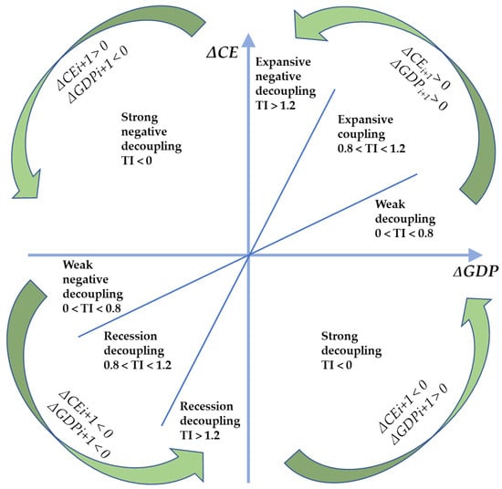 where Ti+1 denotes the decoupling elasticity index in period i+1, %ΔCEi+1 and %ΔGDPi+1 denote the growth rate of carbon emission and GDP in period i+1, ΔCEi+1 and ΔGDPi+1 denote the growth values of carbon emission and GDP in period i+1, and CEi and GDPi denote the values of carbon emission and GDP in period i, respectively. Eight different decoupling states are classified according to different Ti+1, ΔCEi+1, and ΔGDPi+1 values, as shown in Figure 2.