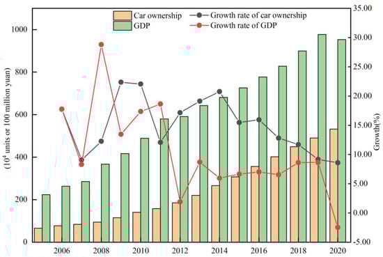 In 2021, Beijing, Chengdu, and Chongqing were three cities with more than five million cars. Chongqing ranks third with 5.636 million units. As can be seen from Figure 4, Chongqing’s car ownership grew from 654,100 units in 2005 to 5,321,600 units in 2020, with a growth rate of 713.37% and an average annual growth rate of 14.99%. The growth rate of Chongqing’s car ownership between 2005 and 2018 remained above 10% except for a few years, and the growth rate from 2018 to 2020 slowed down and stayed at about 8%. The highest growth rate occurred in 2008–2010, above 22%, showing that the number of cars purchased in Chongqing showed rapid growth during these two years. The 2013–2014 growth rate peaked at 2.66 million cars, after which the growth rate of ownership steadily declined. CNY 95.287 billion, a growth rate of 326.09%, with an average annual growth rate of 110.15%, occurred. The highest growth rate of CQTI-GDP appeared in 2008, reaching 28.81%, then dropped to below 20%, and the whole of 2013–2019 showed a more stable state, remaining at about 8%. Suddenly, 2019–2020 shows a sharp decline, from 8.65% to −2.5%, with fluctuations of up to 10%.