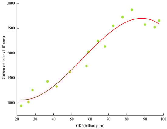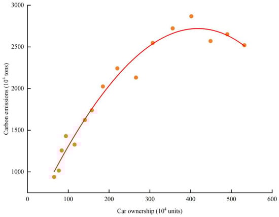 After the calculation of CECQTI in the previous section, this section fits CECQTI to CQTI-GDP and Chongqing city car ownership, respectively, as shown in Figure 5 and Figure 6. Among them, the fitting of carbon emissions and GDP shows a certain inverted N-shaped trend, and the fitting of carbon emissions and car ownership shows a certain inverted U-shaped trend. However, this does not mean such a trend is inevitable between carbon emissions and GDP and car ownership, and it needs to be verified afterwards. In the process of economic and environmental development, it is greatly influenced by the urbanization process [], so this study introduces the urbanization rate as a control variable in the EKC curve model.