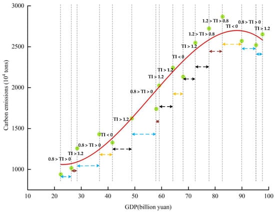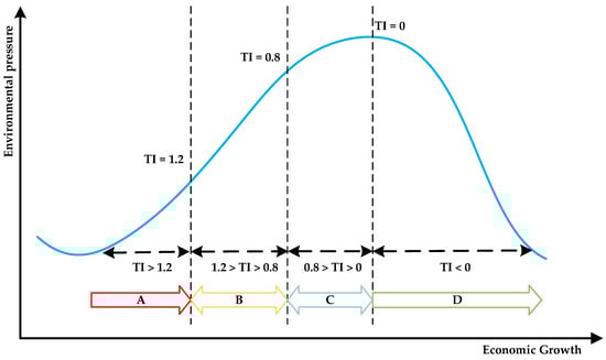 The EKC curve and Tapio decoupling model are coupled and integrated in Figure 9 into four regions, A, B, C and D []. TI = 1.2, TI = 0.8 and TI = 0 are the turning points of strong decoupling and coupling, respectively. Stage A indicates expansionary negative decoupling, where economic development comes at the cost of environmental stress. Stage B is slightly better than stage A, where economic development is synchronized with environmental stress. Stage D is the best, where rapid economic growth is accompanied by rapid environmental decline.