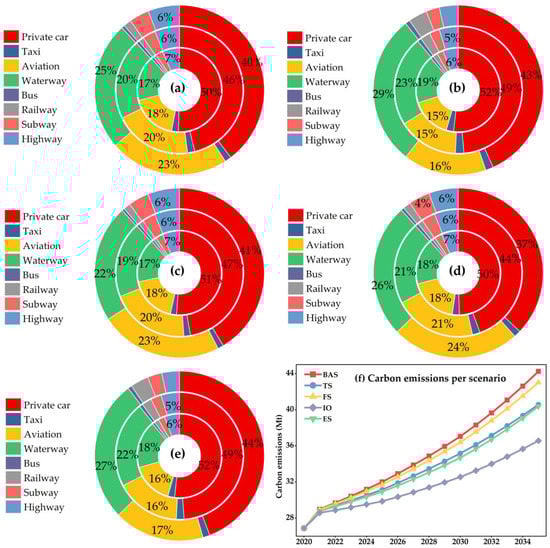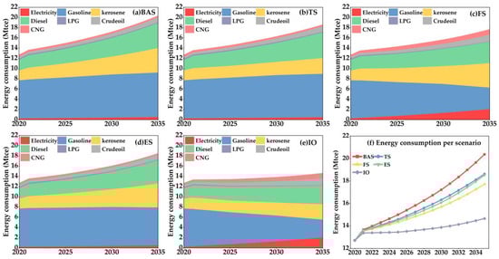 - According to the LEAP-Chongqing model, it is known that by 2035, the energy consumption of TS, FS, ES, and IO scenarios will decrease by 8.55%, 12.98%, 9.07%, and 28.04%, respectively, relative to BAS. The share of gasoline, diesel, and aviation kerosene are as high as 80–90%. Carbon emissions of TS, FS, ES, and IO scenarios are reduced by 2.76%, 8.74%, 8.30%, and 17.36%, respectively, in 2035 relative to BAS, and private cars generate 41–52% of carbon emissions. Energy mix adjustment and private cars are key to carbon reduction [,]. Multi-scenario simulations show that a single policy’s energy saving and emission reduction effect is not satisfactory, and integration measures should be considered in subsequent policy studies.