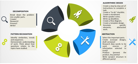 Computational thinking is understood differently in different fields, but all agree that it is about a person’s versatility in digitisation, problem solving and relevance inside and outside the classroom. Li et al. [10] argues that students’ skills have played a pivotal role in understanding the rapid changes in the world by integrating it as a model of thinking. Related to this, many researchers [11,12] have explored the use of computational skills to build approaches and practices in educational contexts. Computational skills were defined by the International Society for Technology in Education (ISTE) as a “problem-solving methodology than can be automated and transferred and applied across subjects” [13]. Figure 1 explains the main issues with computational thinking skills.