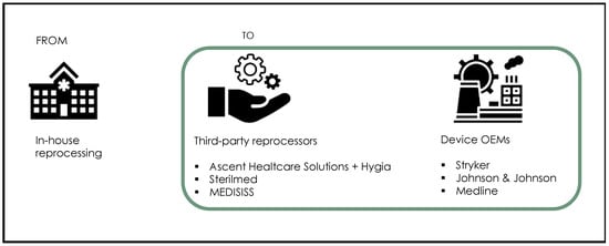 Starting from the 1980s, single-use (or disposable) products have increasingly become the standard choice for medical devices. While they reduce liability and complexity for hospitals [7], single-use medical devices are emblematic of the ‘take, make and dispose’ model of linear economies, which results in vast amounts of waste and emissions, with associated environmental and public health damage [4,8]. Establishing a circular supply chain for single-use medical devices would make a meaningful contribution to reduce health care-generated emissions as part of the formal pledge by many countries worldwide to move towards a more sustainable health care [9]. In line with the circular economy framework, circular supply chains focus on “prolonging product, component and material life cycles through coordinated forward and reverse supply chains” [10] (p. 709). One way to drive circularity in the supply chain of single-use medical devices is to apply the possibility of hygienic recovery through decontamination, high-level disinfection, cleaning and sterilization, if required (a process referred to as ‘reprocessing’). Though labelled as single use by their Original Equipment Manufacturer (OEM), many types of single-use devices can be reprocessed one or more times, allowing to extend their life and generate environmental and economic benefits. Reprocessing is a permitted and a regulated practice in several developed nations, including the United States, Canada, Japan and Australia. It is currently regulated also in the European Union, though individual Member States may decide not to allow reprocessed single-use devices in their territory. Historically, reprocessing of single-use medical devices was performed in-house by hospitals until it became regulated; at that point, it moved to third-party reprocessors, who specialize in reprocessing capabilities and take over the risk of device reuse [4,11]. However, in the last few years, several device OEMs (including Stryker, Johnson & Johnson, Medline and Cardinal Health) have expanded into reprocessing, offering health care facilities the opportunity to purchase both devices and their reprocessing from the same provider. By doing so, these OEMs have taken a ‘green servitization’ orientation.