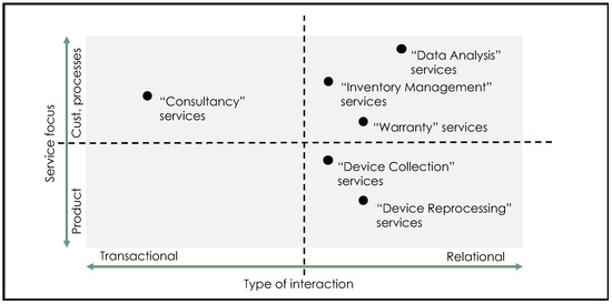 The classification in Figure 3 adopts the well-known, two-dimensional model proposed by Oliva and Kallenberg [72]. The first dimension is the type of interaction between provider and customer, ranging from discrete, one-off transactions with specific/limited content to close collaborative relationships involving partnership arrangements over an extended time frame [73]. This dimension entails also different levels of value co-creation, from little or no customer engagement in the service process (transactional services) to highly interactive customer touchpoint journeys (relational services) [54]. The second dimension is the focus of the service, which may be either on the product or on customer processes related to the product. While product-oriented services focus on product availability and functionality, customer process-oriented services focus on improving customer processes related to the product [74]. Most of the services offered by device OEMs are relational, entailing high levels of customer input, communication and co-creation over extended time frames. Clearly, in their green servitization initiatives, device OEMs aim at being partners of their customers rather than generic suppliers of physical products (new or reprocessed). Consistent with this, most of the services are provided free of charge. Some of the services involve high levels of customization, such as data analysis or consultancy services. Reprocessing services, in particular, typically involve customized pricing (depending on the volume of purchases) and risk-sharing arrangements, whereby OEMs commit to provide enough reprocessed devices and health care facilities commit to continue to use enough devices.