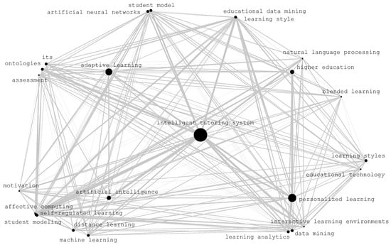 In Figure 1, the bibliometric map of the top 28 keywords after grouping is presented. As stated in Section 2, we put in the center the keyword “intelligent tutoring system”, and around it the next top four keywords, which are: