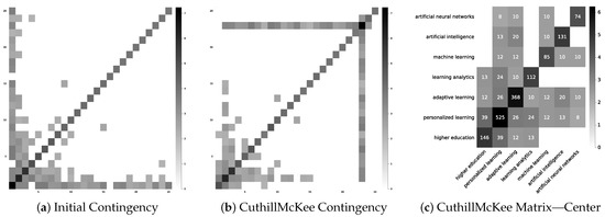 Similar findings are rendered if we re-arrange the co-occurrence matrix for keywords, using the Cuthill McKee algorithm [27,28] as per Figure 2. Particularly, by re-arranging the rows and columns of the matrix to obtain the majority of the elements near the main diagonal, we see that the keywords “higher education”, “personalized learning”, “adaptive learning”, “learning analytics”, “machine learning”, “artificial intelligence”, and “artificial neural networks” are highly related pair-wise.