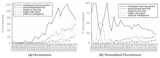 It is of great importance to highlight not only the structure of the studied field and its sub-categories, but also the evolution of the research, along with future trends. In order to do this in a generic, quantitative manner, we perform time-series analysis. Particularly, in Figure 3a, we demonstrate the evolution of the number of the top five keywords’ occurrences over time. We may observe a clear increasing pattern for all keywords, apart from “intelligent tutoring system”, which presents a decreasing pattern after 2017. This is further confirmed if we plot the normalized time-series, which is the initial counting, divided by the total number of papers published in the current year for the specific data set. This is depicted in Figure 3b, where “intelligent tutoring system”, decreases constantly, contradictory with the other top four keywords.