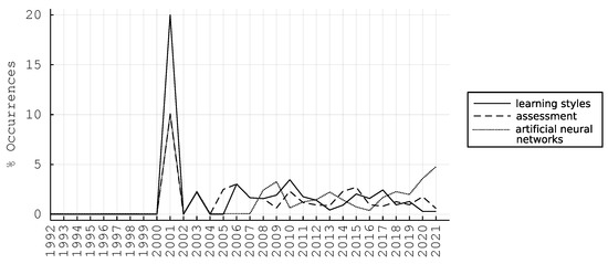 Furthermore, by identifying all the pairwise Pearson correlation coefficients of the time-series, we obtain Figure 4, depicting “learning styles” to be highly correlated over time with “assessment”, with a peak in 2001, a Pearson correlation of 92.7%, and, similarly “learning styles” with “artificial neural networks”, having a Pearson correlation of 79.3%.
