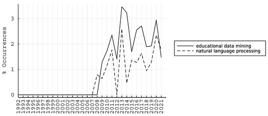 Similar evolution of “educational data mining” and “natural language processing” time series.