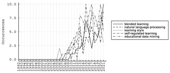Hence, we identify as emerging trends the following keywords: “blended learning”, “natural language processing”, “learning style”, “self-regulated learning”, and “educational data mining”.