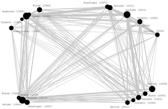 Another study that refers to the term “intelligent tutoring systems” of the map is the work of VanLehn et al. [45]. Their research reported results from 5 years of using the Andes [45,46] tutoring system in introductory physics courses taught at the U.S. Naval Academy. The authors noted that students who used the Andes for homework got significantly higher exam scores than students in control groups who did paper-and-pencil homework.