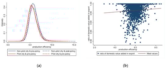 To test the relationship between the LCPP, production efficiency and firms’ ratios of domestic value added in exports, we first drew the distribution of firms’ production efficiency in pilot and non-pilot regions before and after the implementation of LCPP (shown in