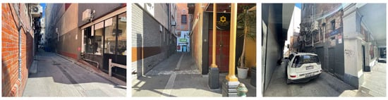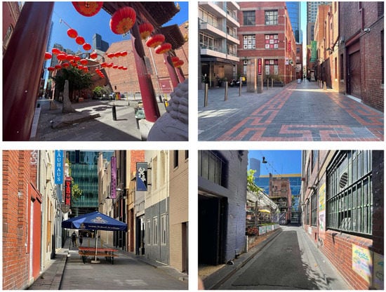 Laneway culture is unique to the urban fabric of Melbourne, which Chinatown is an essential part of [56]. Laneways in Melbourne work as a network that navigates pedestrians and serves as a critical contributor to the city’s overall identity [58]. From the Action Plan and the field observation, a total of twenty-four laneways are identified, including twelve open-end laneways and twelve close-end laneways. Most of the twelve close-ended laneways are used for services (loading bay and back gates) in the precinct. Open-end laneways, all running in the north/south direction, are laneways that prioritise pedestrian movement and commercial activities (Figure 9). In particular, Cohen Place is now presented as a major laneway cultural hub, where the Museum of Chinese Australian History is located. A contrast was observed between the livelihood in laneways. Laneways that prioritise commercial activities and pedestrians are observed to contain a variety of functionalities, such as the museum, restaurant and bar. Among these laneways, Tattersalls Lane, Cohen Place and Market Lane were the most vibrant (Figure 9). Despite its relatively narrow width compared to other pedestrian-friendly lanes, Tattersalls Lane (Figure 9) represents a lively streetscape with restaurants, a cultural society and a popular outdoor bar [59]. Market Lane is mainly employed as an outdoor seating area for restaurants from the observation (Figure 9) while creating a visual connection between Little Bourke Street and Bourke Street. In Cohen Place, the pathway to the museum is led by the pavement design with traditional Chinese patterns and museum banners along the way (Figure 9), due to the low visibility of the museum from the central street. Contrasting to the vibrancy of those laneways that prioritise pedestrians, laneways for services in Chinatown are not favoured by the pedestrians, such as Hughs Alley, Star Alley and Bullens Lanes (Figure 10). Most of the service lanes were observed to be occupied by rubbish bins, exposed buildings services, and parking with low-level pedestrians. Despite the occasional graffiti and pavement painting, no other treatments on the ground level were observed to add vibrancy to these service lanes.