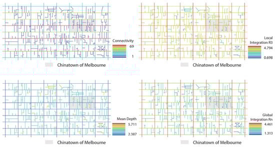 The axial analysis was developed based on the space syntax theory by Hillier and Hanson [24,41]. It is often performed to assess the spatial layout represented as an axial map, commonly extracted from urban maps or architectural floor plans. In this study, four key measurements are utilised to attain the macro-scale street characteristics of Melbourne’s Chinatown and how it fits in the existing grid system. Table 2 summarises the four measurements, including connectivity, mean depth, axial integration and intelligibility [41,44,45,46]. Table 2 can benefit future studies with clear identification of the formulas and interpretation of space syntax parameters with respect to the original space syntax methodologies, which are often absent in existing research. Depth map X is used to aid the data extraction, the analysis process and visualisation. Only streets within Chinatown are presented in the space syntax result tables to resonate with the study’s scope. However, for the macro-scale analysis, the entire Melbourne CBD is considered in assessing and interpreting the data in Depthmap X. Streets in the precinct are categorised into three types, a, b and c, denoting laneways, north to south main streets and east to west main streets. Twenty-three ‘type a’ streets are recorded, while six main streets are classified as ‘type b or c’.