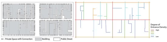 Based on this theory, scholars affirm that by studying the street network’s spatial structure and the interrelation between buildings and adjacent street segments, one can understand micro-scale urban spatial relationships between private and public spaces [40,50]. Later, several measurements were developed and tested to address how building openings are connected to the street network, the degree of topological depth from private space to public space and the intervisibility between entrances and windows. Key measurements include entrance density, street constitutedness, street intervisibility, and topological depth between private and public street spaces [24,40,50,53,54]. Measurements derived from this tactic are developed mainly to quantify spatial parameters for the building–street interface and how to present degrees of active frontage. Table 4 summarises these variables and their diagrammatic explanations. Field observation is essential in identifying each street’s entrances and private–public topological relationships. Van Nes and Yamu (2021) identified some limitations of the urban micro-scale methods, including the difference between urban liveliness during day and night [39]. They recommend further research to use these methods in case studies with different cultural backgrounds, which is piloted in this study with Melbourne’s Chinatown.