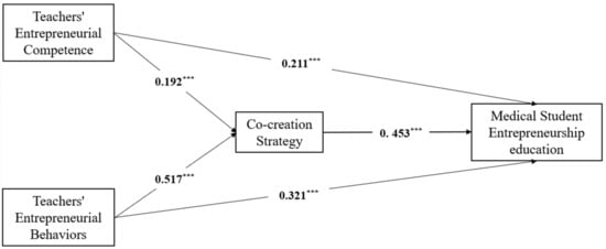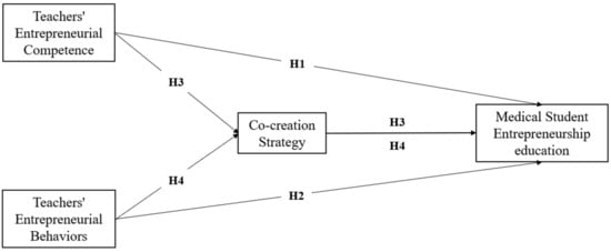 Internationally, we found that entrepreneurship in medical education has narrow and broad definitions in the context of different nations. For example, in Germany, various universities have introduced management competences and entrepreneurial issues into the medical curriculum as these are essential for self-employed physicians [14]. Meanwhile, in the United States, in allopathic medical schools, innovation and entrepreneurship programs in medical education are becoming increasingly common to help develop students’ competence in complex problem solving and solution design, and these programs include some educational themes of innovation, entrepreneurship, the business of medicine, and leadership [2]. At the same time, it is becoming increasingly important to promote the implementation of sustainability practices in entrepreneurship education. A common goal of entrepreneurship education is to cultivate value-oriented entrepreneurs for a sustainable society; all entrepreneurs of the future are in school today, and they should assume social responsibility so that future generations can access the development of well-being, self-respect, and freedom. Academics have suggested monitoring student entrepreneurship in terms of sustainable development [15,16]. However, we did not find any empirical studies on monitoring medical student entrepreneurship in the field of sustainable development in existing studies. To fill the gap, we surveyed 714 teachers in Chinese medical universities; we combined the critical role of teachers in entrepreneurial learning and pedagogical practices from the perspective of teacher entrepreneurship [17,18]; and we provided empirical evidence on the effect of the teachers’ entrepreneurial competence (TEC), the teachers’ entrepreneurial behaviors (TEB), and the co-creation strategy (CCS) on MSEE.