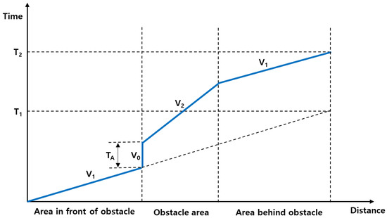 As the effectiveness of rock drop obstacles is closely related to the firepower and maneuver plan in a combat situation, it is impossible to quantify according to the size and scale of obstacles. For example, even if a rock drop obstacle is small in size and scale, the tactical commander’s operational goal can be achieved as long as the obstacle is protected by sufficient firepower and military forces. In contrast, however solidly an obstacle is installed, the enemy can subjugate it if there is no resistance. In other words, obstacles are not intended to perfectly disrupt the maneuver of the enemy but to delay it for a desired time or to attract the enemy to the desired place. Figure 2 is a typical example of evaluating the effectiveness of an obstacle with respect to time and speed.