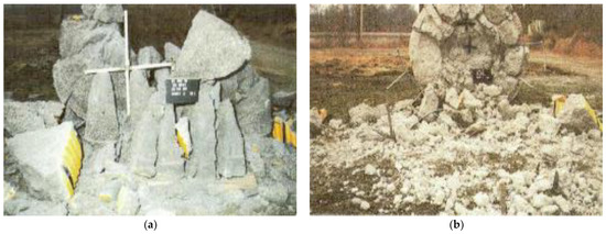 Table 1 presents the number of projectiles of ammunition required to destroy a rock drop. The types of ammunition were selected among anti-tank explosives for special purposes, such as the destruction of concrete structures. In the experiment, one or two projectiles destroyed each rock drop into pieces that could be handled by typical engineering equipment. As shown in the experimental results below, most rock drops, reinforced and unreinforced, were destroyed by one or two anti-tank projectiles. When the capability of standard commercial engineering equipment was considered, the maximum delay time for rock drop obstacles arranged in two columns and five rows was analyzed to be approximately 30 min. Figure 3 shows the sizes and shapes of rock drops destroyed in the battle experiment.