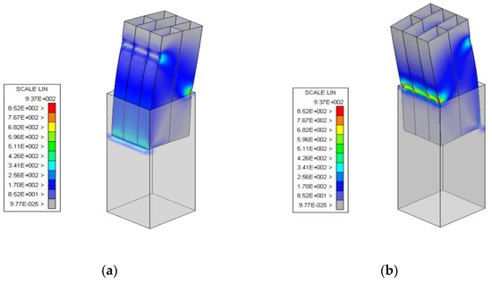 The modeling also assumed that the enemy tank had a towing force of 70 tons, and this power was generated at a contact point 1 m above the ground. The force corresponding to the maximum towing force of the enemy’s tanks was applied in the analysis, which was implemented as a static load. The towing force was converted into pressure units under the assumption that the contact surface of the tank was 300 mm × 10 mm. The force was applied to the bollard body in increments of 1 ton until plastic deformation. Table 3 presents the material properties used in the finite element model.