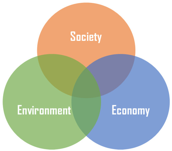 The Organization for Economic Cooperation and Development (OECD) introduced the concept of sustainability with respect to project management [7]. Sustainability includes sustainability assessment, especially in the decision-making stage of a project. Moreover, it is applicable to every field as sustainability encompasses not only policy-making but also the planning, scheduling, and implementation of a project [8,9]. As shown in Figure 7, the sustainability assessment is based on the impacts on three main areas: economy, environment, and society [10,11].