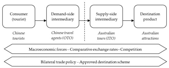 The Australia–China travel context provides a unique setting in which to examine sustainability within the tourism supply chain. Within the context of this study, we present a simplified view of tourism supply chain management, focusing only on the central dyad—tour operator and travel agent. For a comprehensive treatment of tourism supply chain management, we would direct readers to Ibarnia et al. (2019). This is because a large proportion of recreation tourism from China is controlled by the Approved Destination Status (ADS) scheme. Introduced in 1997, the ADS scheme represents a bi-lateral trade arrangement between China and other countries, wherein partner countries work together to achieve economic and policy related outcomes from tourism. For instance, China uses the ADS scheme as a way to influence the destinations that its citizens can easily access, with a view to achieving and maintaining a balance of trade [26].