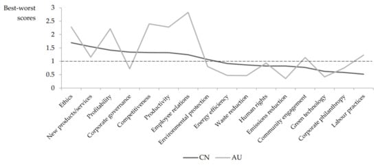 The interpretation of Figure 3 requires some discussion because the best-worst scores are on a relative scale. In other words, a score of 2.83 for employee relations within the Australian sample reflects that this factor is more than eight times more important than emissions reduction with a score of 0.35. Likewise, the Chinese respondents viewed ethics (1.69) as being more than three times more important than labor practices (0.52). Another way of interpreting these scores is with reference to the dotted line shown in Figure 3. This line represents parity, where factors above this line can be considered to have a positive contribution to CSR orientation, whereas the factors below make little or no contribution. When we take the relative nature of the best-worst scores into account, it is clear from Figure 3 that the Australian and Chinese respondents also differ meaningfully in their response patterns. The Australian respondents were far more varied in their weightings of the CSR factors, whereas the Chinese respondents appeared to be more conservative. From the perspective of the best-worst methodology, this observation reflects that the Australian respondents were more consistent in their agreement regarding what was more and less important than their Chinese counterparts.