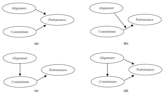 The evidence in support of the second hypothesis is more mixed. While the direct-effects model reveals a significant path between alignment-performance, this path becomes non-significant in the moderating-effects model when alignment is modelled to moderate the commitment-performance path. The mediating models test an alternative explanation to a moderating effect, where alignment is modelled to either fully or partially mediate the commitment-performance path.