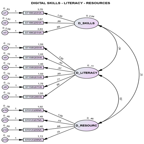 Illustration of the measurement model (CFA) for the digital skills, literacy and resources components of the survey, with the Brazilian sample.