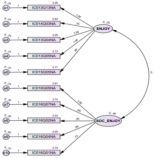 Illustration of the measurement model (CFA) for the digital enjoyment survey component, with the Spanish sample.