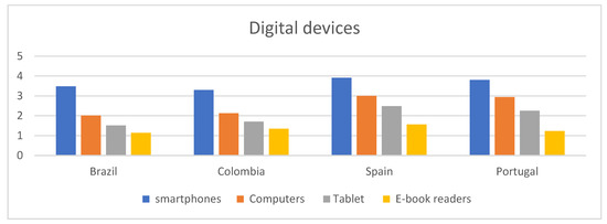 When comparing the differences between countries, statistically significant differences can be seen in practically all the dependent variables and between countries (p < 0.001), except for some isolated exceptions with lower p’s, and only in some cases are there no significant differences. See the results in Table 3. It is interesting to note that in the use of digital resources, the exception is the use of digital book readers, in which Spain and Colombia are compared (MCOL vs. MESP = 0.025).
